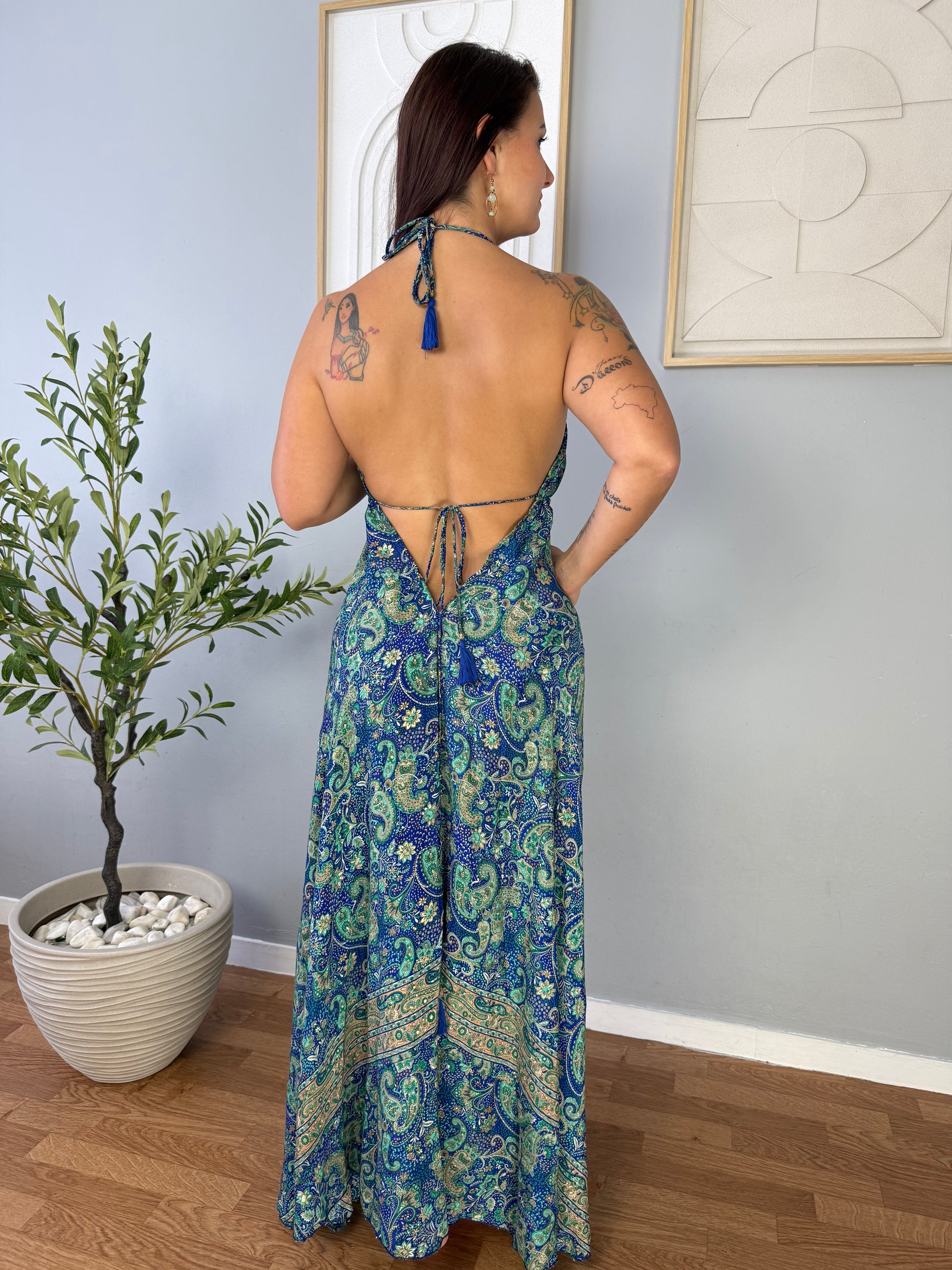 Robe Bohème Bleu Foncé Motifs Verts LYA