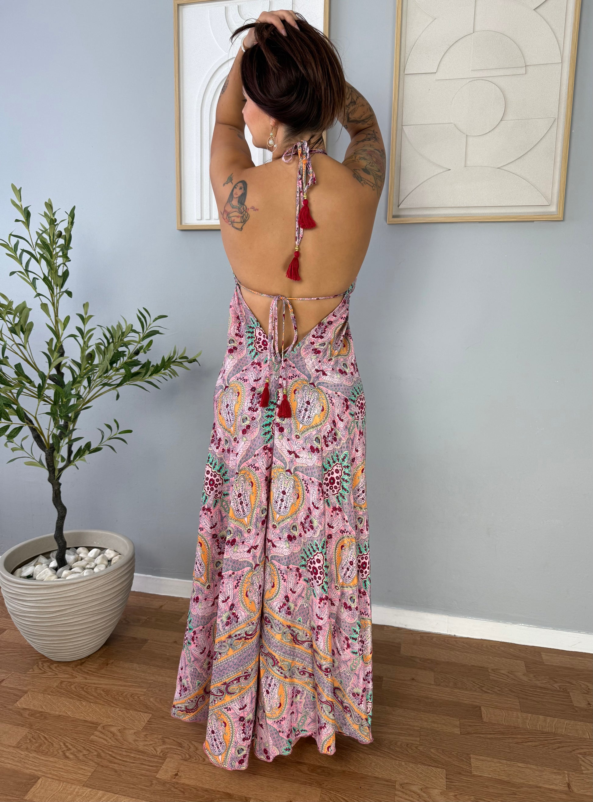 Délicate et aérienne, cette robe longue en soie sublime la silhouette grâce à son décolleté en V et son dos nu ajustable.